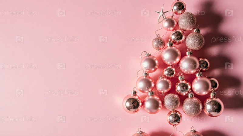 Прекрасное отображение розовых шаров на Рождественской елке, искусственно расположенных на мягком розовом фоне для праздничного и веселого новогоднего духа