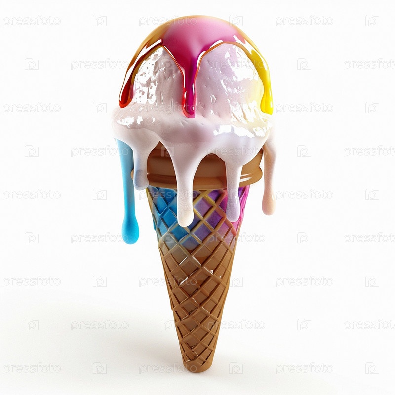 Расплавленное 3D мороженое в конусе вафли Сироп, крошки, карамель