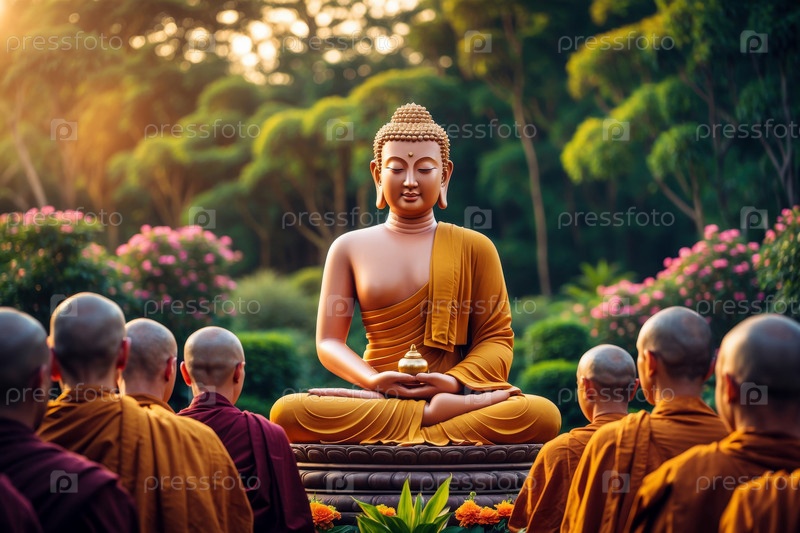 День Магха-Пуджи Традиционная буддийская открытка с поздравлениями, Будда и Его ученики AI Generative