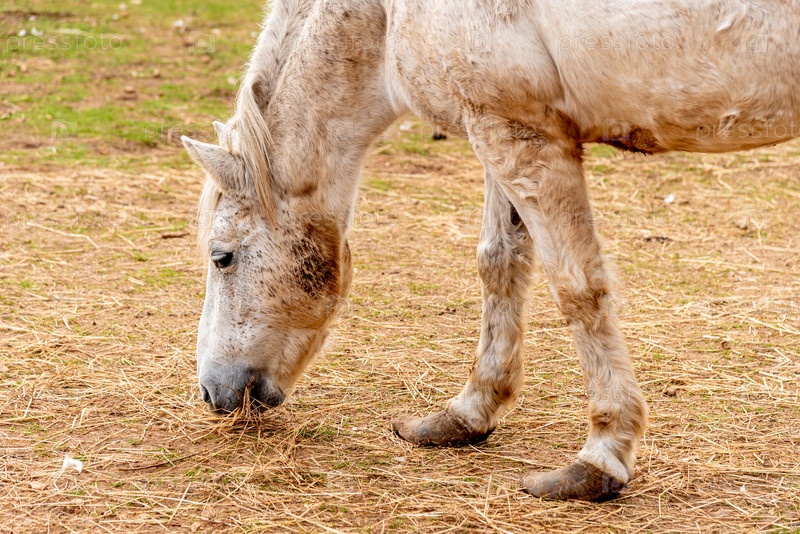 Домашняя лошадь пасется на луговой траве, ферма с животными в открытом пейзаже
