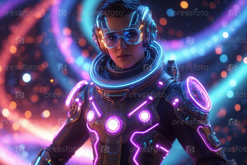 Человек-гуманоид в футуристическом космическом костюме, человек на будущем научном фантастическом завтрашнем фоне AI Generative