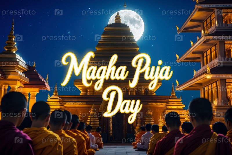 АИ генеративный день Магха-Пуджа традиционная буддийская карта поздравлений Тхеравады, Будды и учеников