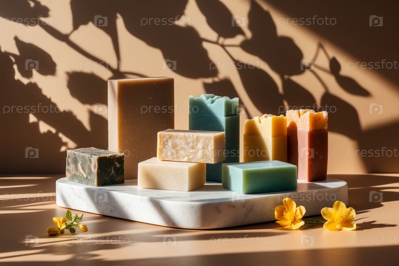 Барный кусок натуральное органическое ароматическое косметическое искусственное мыло ручной работы на стенде на бежевом фоне AI Generative