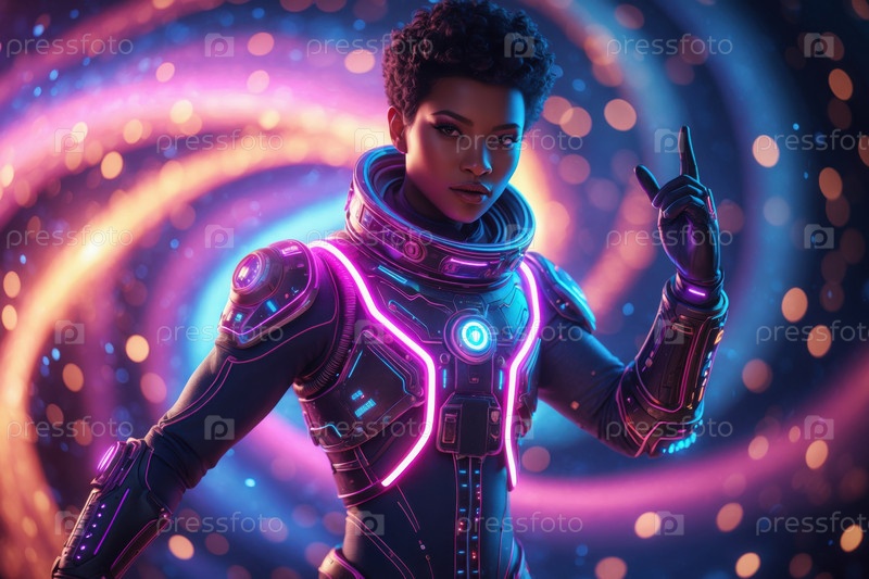Человек-гуманоид в футуристическом космическом костюме, человек на будущем научном фантастическом завтрашнем фоне AI Generative