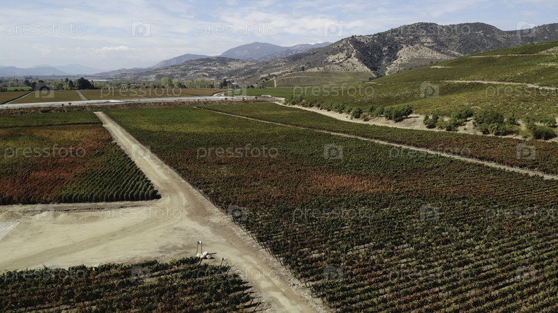 Вид с воздуха, летящий над осенним виноградником и грунтовой дорогой