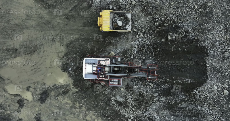 Касательный грузовик, загружающий экскаватор на стройплощадке