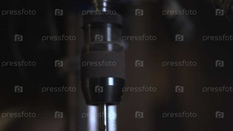 Близкий снимок вращающегося сверла, опускаемого из бурового пресса в мастерской.СМИ