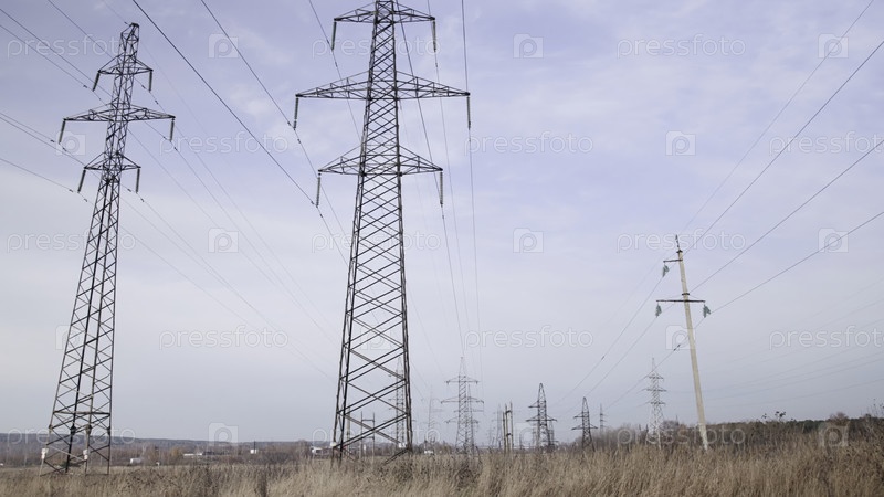 Изображения промышленных ландшафтов, дальние полюсы передачи под приглушенным небом вызывают одиночные промышленные сцены