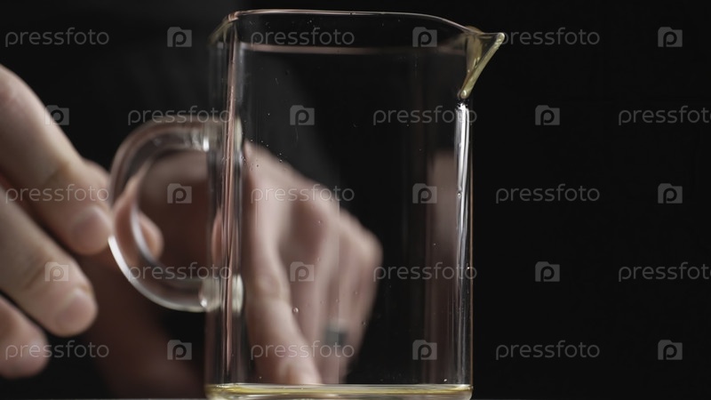 Очень подробное и крупное изображение руки, которая аккуратно поднимает стеклянную кружку с небольшим количеством жидкости