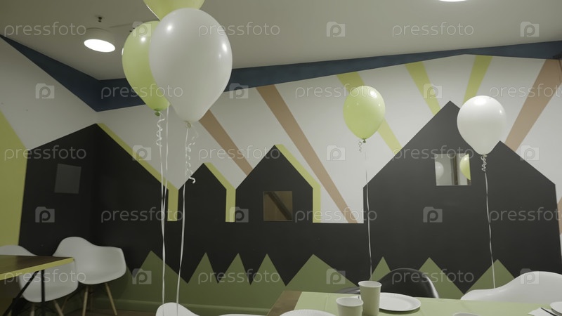 Балоны, плавающие над столом в декорированной комнате