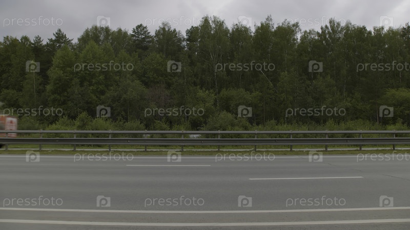 Спокойная и спокойная сцена длинной шоссе, граничащей с пышными зелеными деревьями под обширным облачным небом