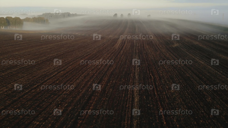 Вид с воздуха, летящий над орошенным полем в туманное утро