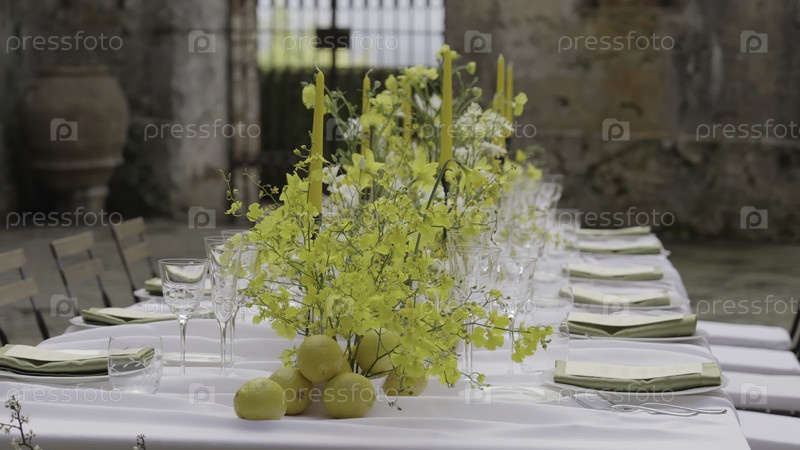 Элегантная желтая столовая обстановка с лимонами и орхидеями в деревенском дворе