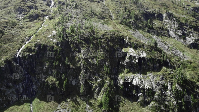 Водопад, спускающийся в каскад по склону горы и покрытый растительностью