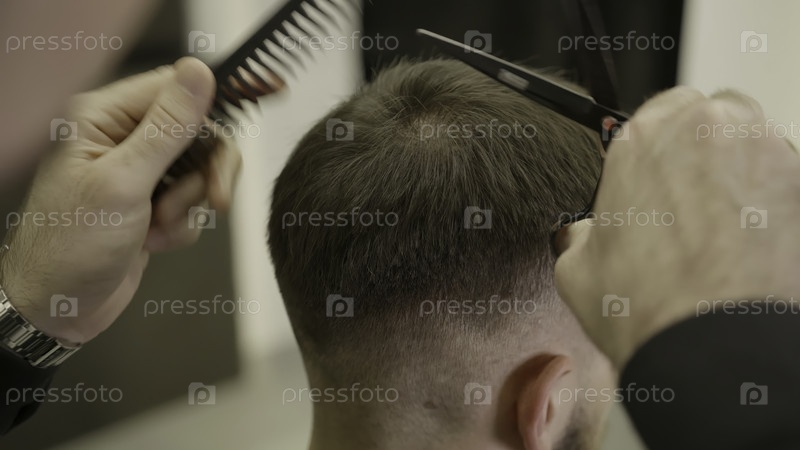 Барбер режет клиенту волосы ножницами