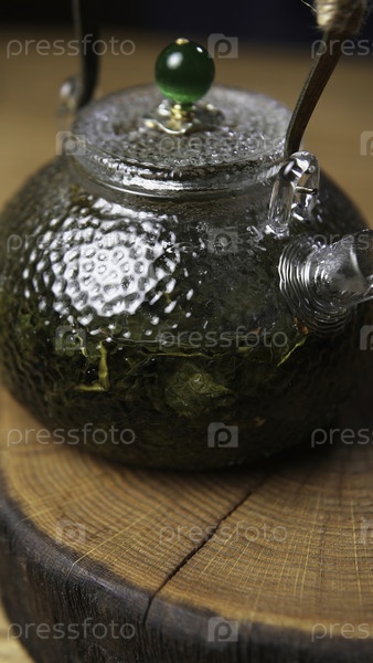Красивый стеклянный чайник, демонстрирующий яркие зеленые листья чая, улучшая замечательный опыт заваривания чая