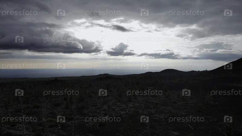 Вулканический ландшафт с сожженным лесом под штормовым небом
