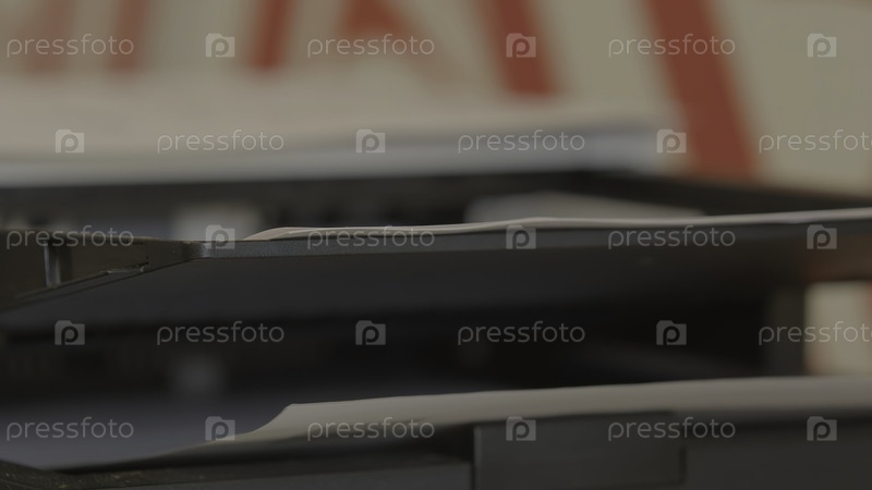 Документы аккуратно уложены на полке принтера в организованной среде офисного рабочего пространства