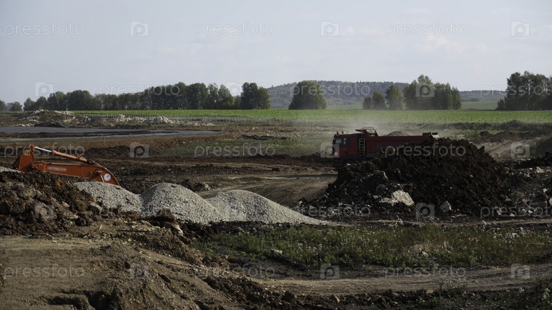Экскаватор загружает самосвалы на стройплощадке
