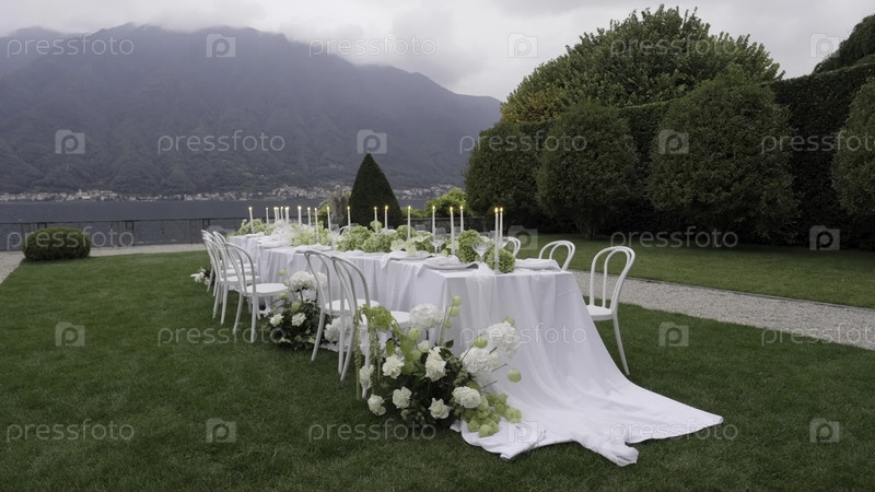 Элегантный белый свадебный стол с видом на озеро Комо