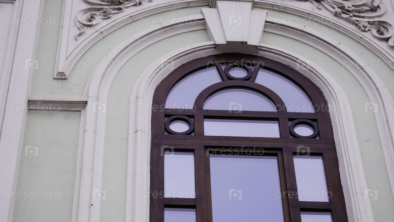 Фасад старого здания с высокими арочными окнами и резными элементами