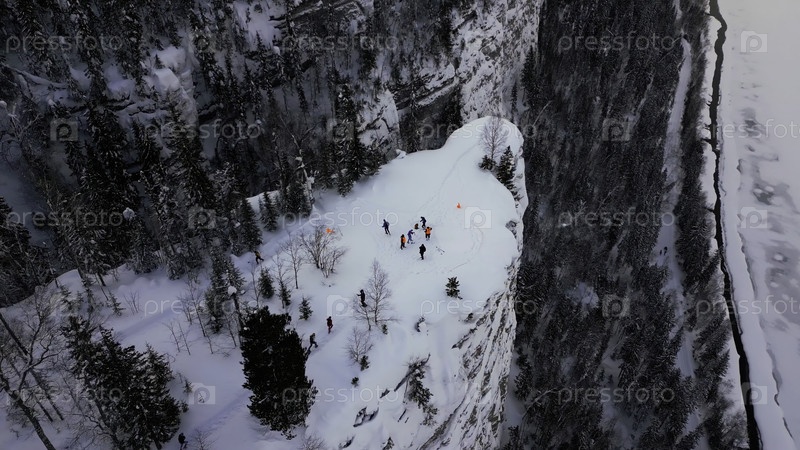 Вид с воздуха зимнего леса и группы пешеходов.Клип.Люди, идущие по белоснежной горной вершине в окружении густого леса