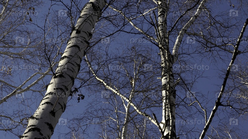 Морозные лысые ветви деревьев на фоне голубого солнечного неба. СМИ. Зимний или осенний фон с березовым лесом