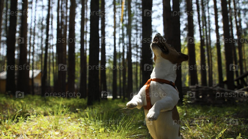 Джек-Расселл терьер веселится в летнем лесу.Сток кадры.Процесс тренировки милого пса в солнечный день