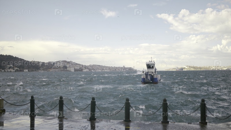 Бурящее море. Действие. Вид на морской пейзаж, парусный корабль и голубое небо над головой
