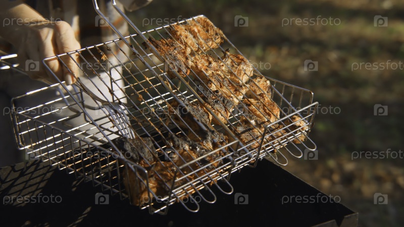 Курицу вынимают из барбекю-гриля. Скриншоты. Близкий план курицы на барбекю, помещенной на тарелку в лесу. Отдых с жареным мясом в лесу в солнечный летний день