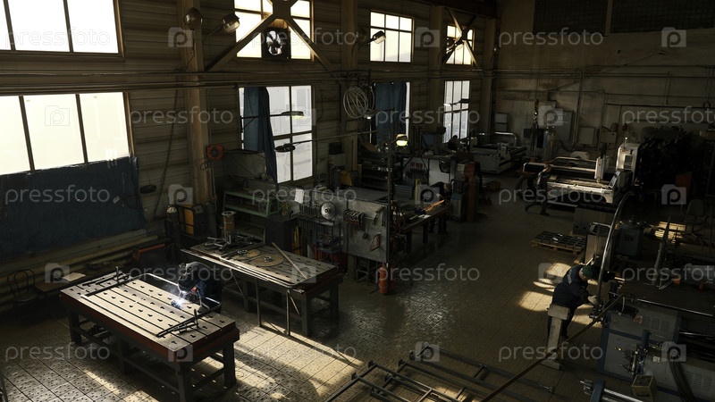 Интерьер мастерской по производству металлов.Креативность.Промышленный фон, вид изнутри фабрики