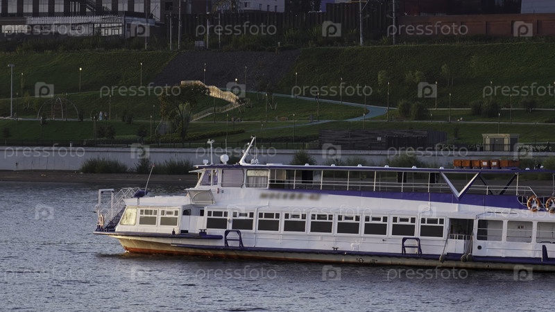 Пассажирский паром, плавающий по спокойной реке возле зеленого городского парка