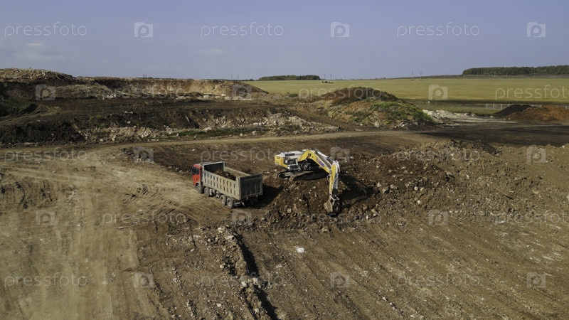 Экскаватор загружает самосвалы на стройплощадке