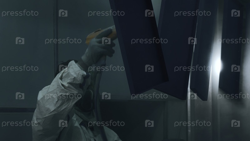 Художник в защитных нарядах красит металлические изделия порошковой краской.Креативность.Процесс покрытия порошком на производстве