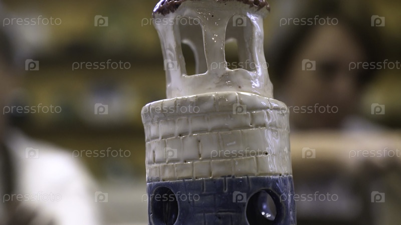 Это керамическое произведение представляет собой потрясающее изображение башни со сложными рисунками и красивыми синими деталями