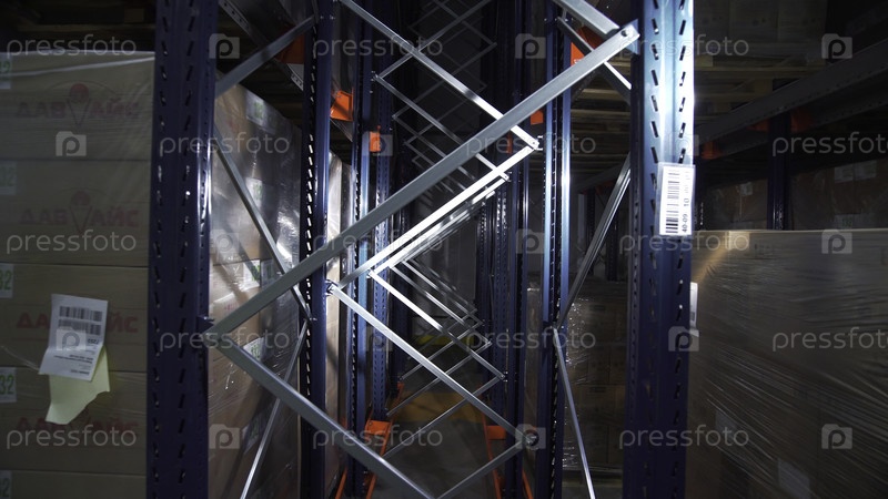 Польша, Варшава- 14 сентября 2022: Расстояние в складе. Креативное. Строительства на складе с товарами. Большой склад с грузом. Движение по структурам склада с товарами