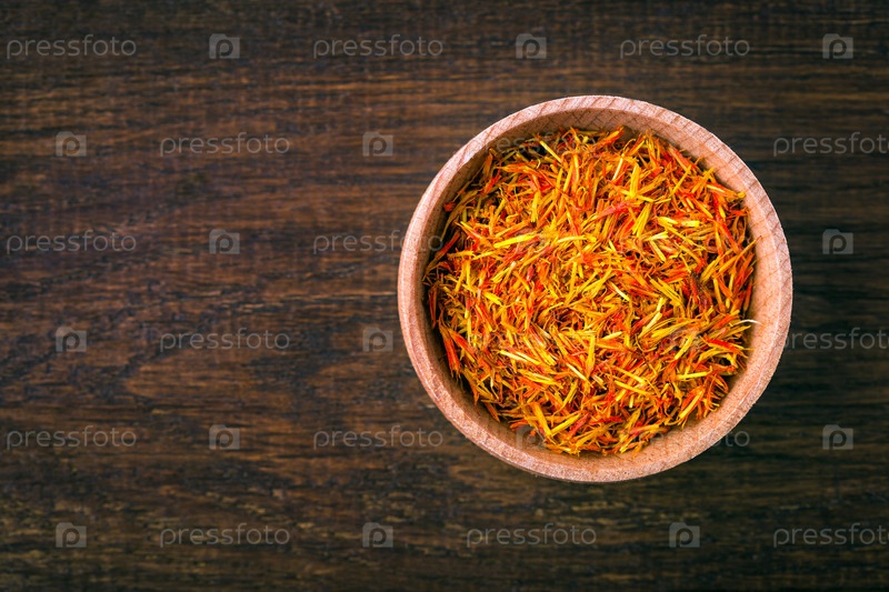 Специя шафран (рыльца крокуса или имеретинский шафран/сафлор) в деревянной миске