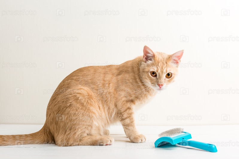 Рыжая домашняя кошка (европейская короткошерстная) рядом с синей щеткой для вычесывания шерсти