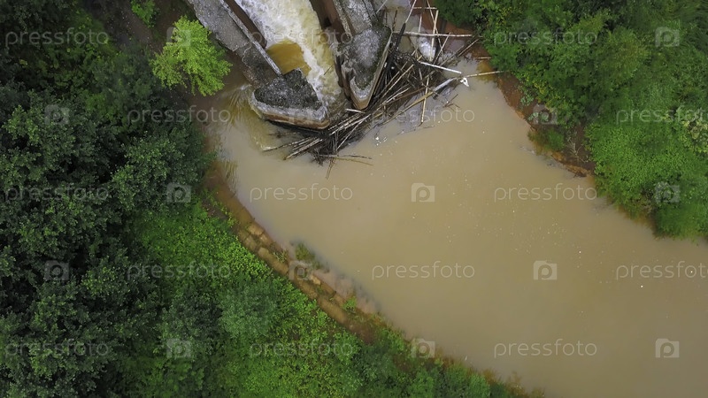 Вид сверху плотины на грязной реке. Клип. Промышленная дамба на грязной реке. Дама или плотина в ложе коричневой реки с зеленым лесом
