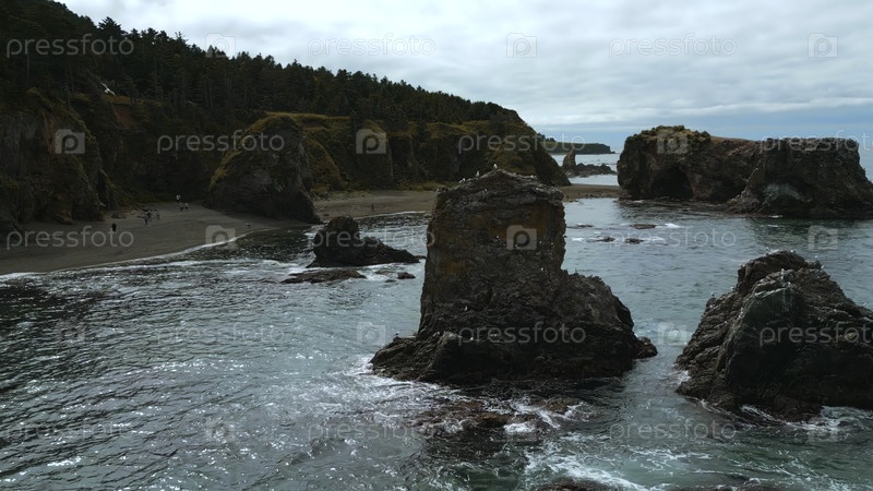 Вид сверху на чайки на скалистом берегу. Клип. Кинематический пейзаж каменистого берега с чайками. Скалы и выступы на берегу моря с чайками на фоне облачного горизонта