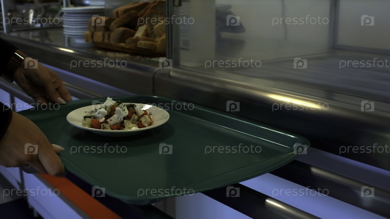 Вкусный деловой обед в буфете. Клип. Сотрудник в специальной одежде выбирает салат в столовой
