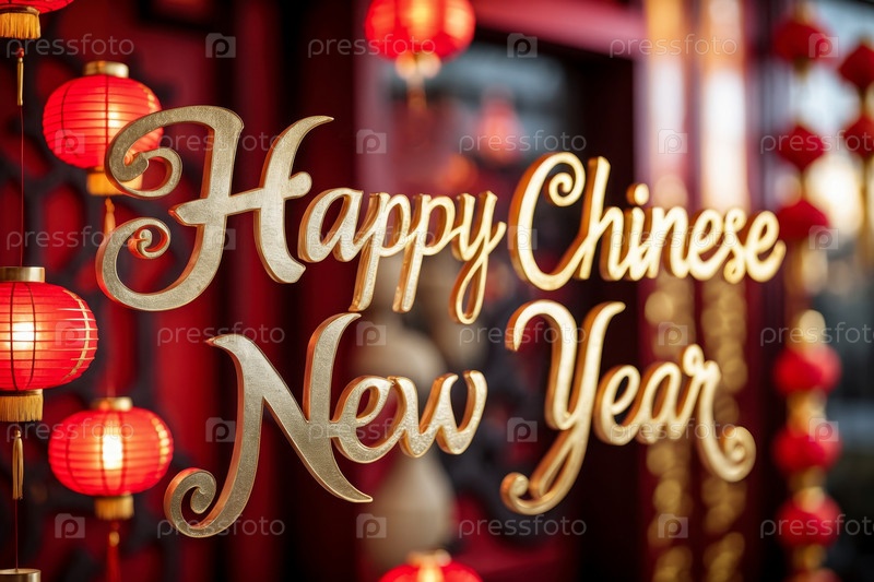 ИИ генеративная китайская новогодняя открытка с традиционными символами Китая - фонарями и вишневыми ветвями