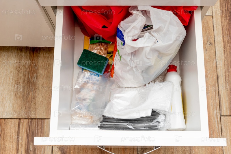 Открытый кухонный ящик для хранения различных приборов, губок, пакетов и моющих средств