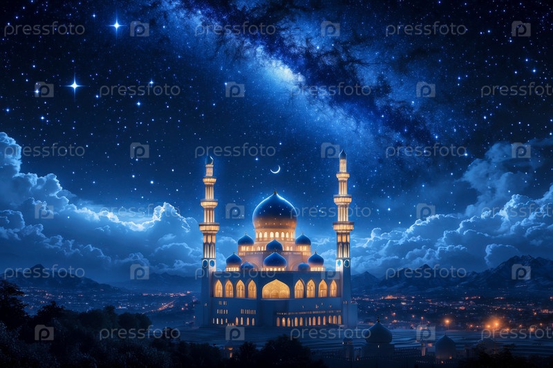 AI Generative Исламская мусульманская мечеть на ночном звездном небе, фон для открытки Laylat al-Qadr