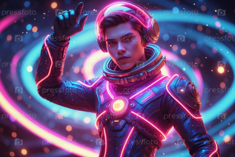 Человек-гуманоид в футуристическом космическом костюме, человек на будущем научном фантастическом завтрашнем фоне AI Generative