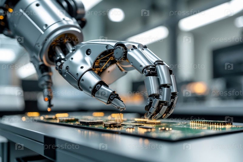 AI Generative Робот искусственного интеллекта собирает оборудование на конвейере, производство будущего