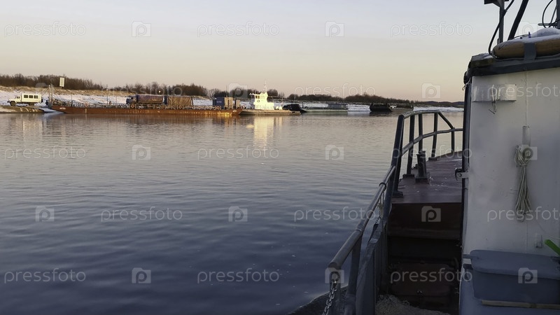 Лодка плывет на фоне речного грузового причала. Клип. Вид с плавучей лодки до берега с пиром. Лодка отплывает к берегу с баржей в солнечный зимний день