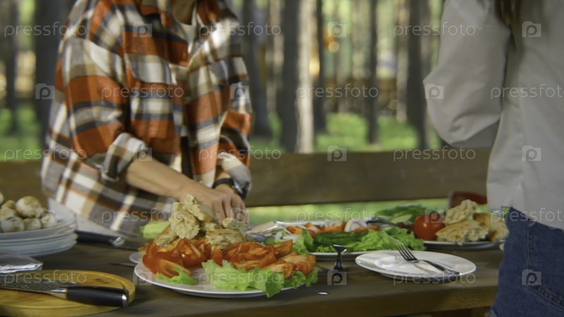 Близкий план людей, разрезающих и готовящих стол в природе. Скриншоты. Люди отдыхают на природе с аппетитным столом с овощами. Яркий стол с овощами и барбекю на природе