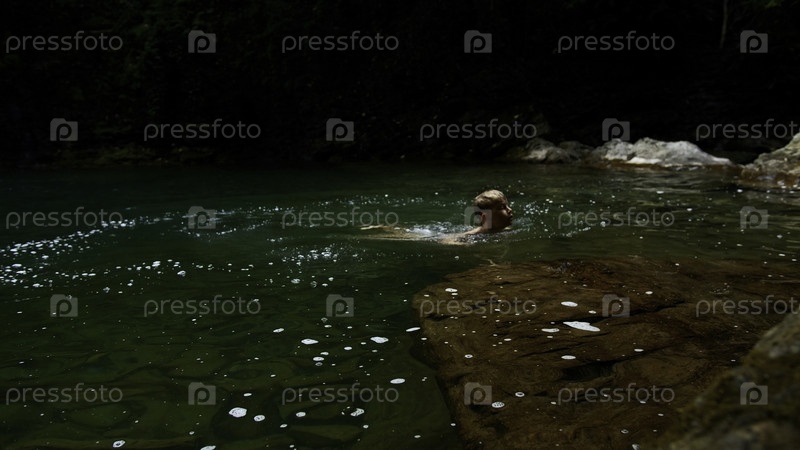Медленное движение мальчика, прыгающего в водопад и естественный пруд