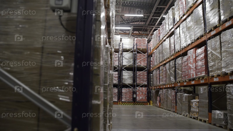 Закрытие коробок на стеллажах, товары в складском депо.Креативно.Организованные продукты на складе в упаковках